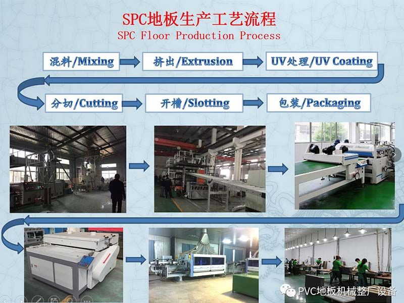 把混好原材料通過上料系統(tǒng)進(jìn)入雙螺桿擠出機(jī),進(jìn)行加熱擠出在180度--195度→進(jìn)入模頭來擠出成型,成型的基材經(jīng)過四輥壓延機(jī),基材進(jìn)行定厚→貼彩膜→貼耐磨層→冷卻→切割;